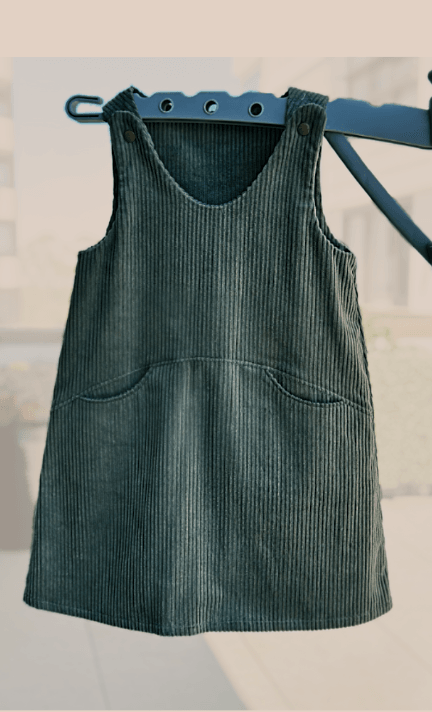 Perfect for a winter day to match with jumper and leggings. This A line tunic is made from corduroy fabric with 2 hidden pockets on the front panel and easy to put on with press studs at shoulder.